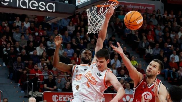 El ala-pívot del Valencia Jaime Pradilla (c) durante un partido del equipo valenciano. | Valencia Basket informó que se medirá el miércoles 12 de marzo, a las 20.30 horas, al Cluj-Napoca rumano en los cuartos de final de la Eurocopa, un cruce a partido único que se disputará en la Fonteta y en el que ambos equipos pelearán por un sitio en las semifinales del torneo. El equipo rumano se impuso este martes como visitante al Wolves Vilnius por 99-100 en un encuentro de octavos de final que también se disputó a partido único y que necesitó de dos prórrogas para definirse. Al haber quedado entre los dos mejores de su grupo en esa ronda inicial, el Valencia se libró de disputar esa eliminatoria y al haber sido el mejor equipo de todo el torneo en esa primera fase tiene asegurada el factor cancha en todos los cruces que dispute. Tanto las semifinales como la final serán al mejor de tres partidos y el ganador del torneo tendrá una plaza para la próxima Euroliga. En el encuentro que el Valencia disputó en Rumanía se impuso con bastante dificultad por 96-105 pero en el que ambos equipos jugaron en la Fonteta venció por un claro 108-80.