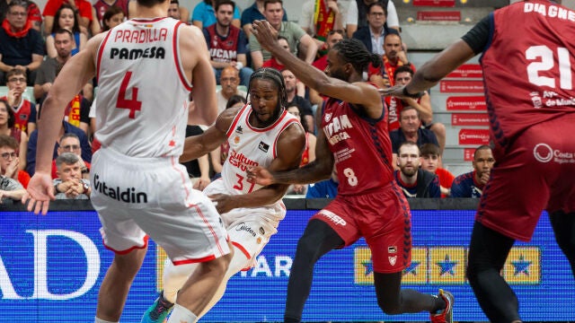 Con Chris Jones en el banquillo con molestias en el tobillo izquierdo y con Davies cometiendo su cuarta falta personal el partido se le ponía peligroso a los valencianos, aunque seguían en disposición de forzar el desempate porque su rival estaba negado en ataque, especialmente en el triple (60-67 en el minuto 34). Ese desatino se personalizó especialmente en Jonah Radebaugh, autor de 24 puntos el sábado en la Fonteta y que sólo hizo siete, todos en el tramo final, en el segundo partido y falló seis de sus siete intentos desde más allá del arco.