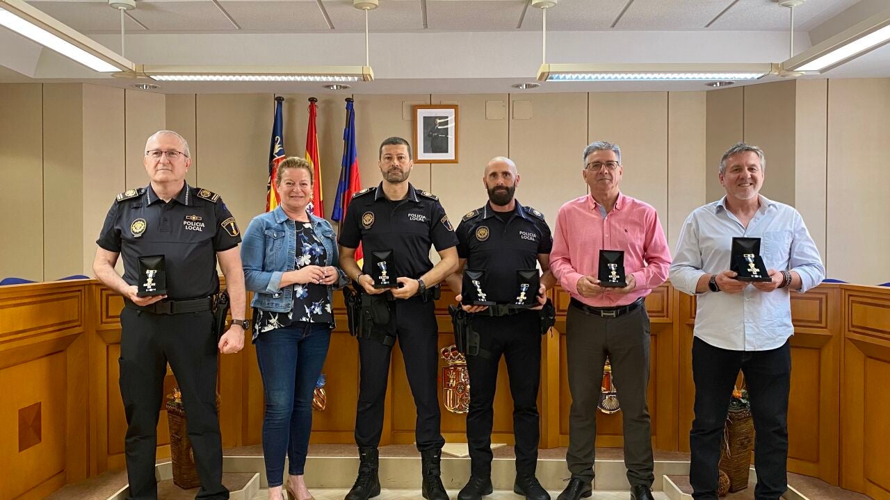Este distintivo se ha entregado a Pedro Serna, inspector de la Policía Local y a los agentes Pascual Salinas, Manuel Cerdán y Francisco Nicolás. Las distinciones se han obtenido una vez que desde jefatura se inicia el proceso para solicitarlas, una vez pa-sadas por pleno y aprobadas, se envían a la Generalitat y esta es quien las concede.