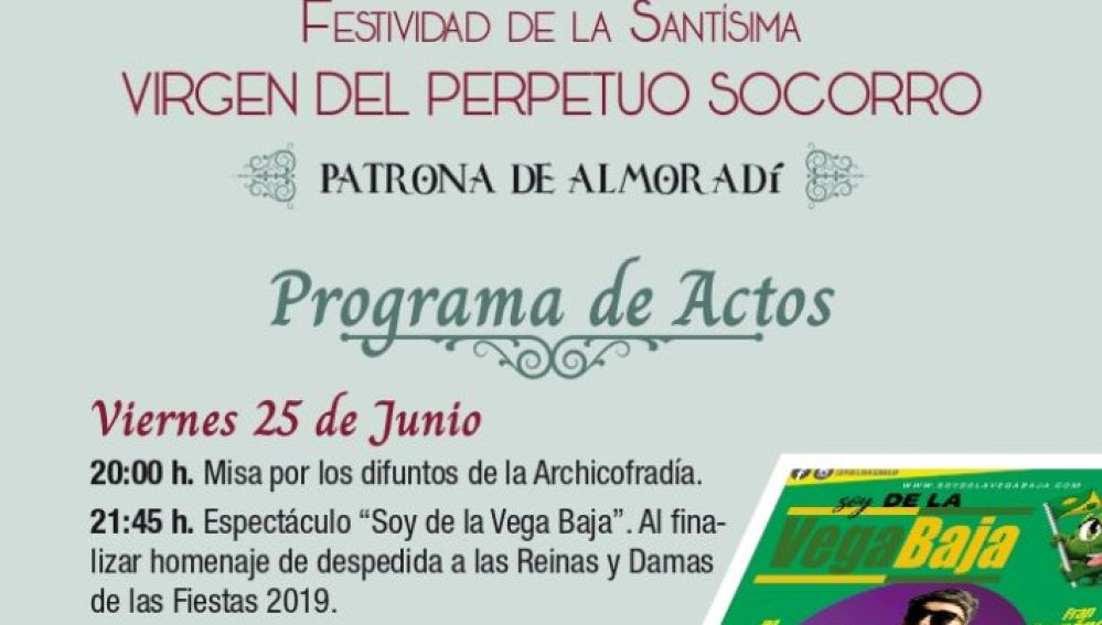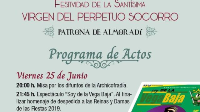 Esa misma noche, a las 21:45 horas, en la Plaza de la Constitución, se contará con el espectáculo de humor “Soy de la Vega Baja” y seguidamente se aprovechará la ocasión para dar la despedida a las Reinas y Damas de las Fiestas 2019.