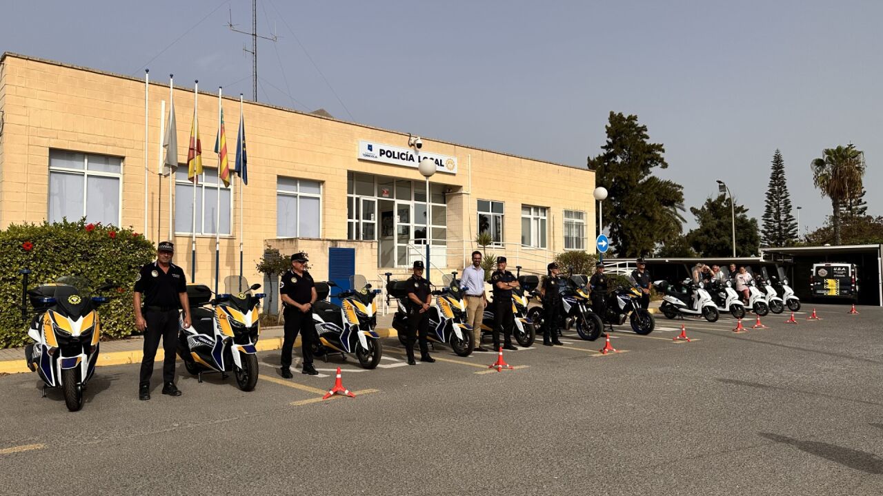 El concejal de Policía Local, Federico Alarcón, junto al Intendente, Alejandro Morer, el Oficial de Policía Local, Juan Antonio Valero, y acompañados de las ediles de Deporte y Parques y Jardines, Concha Sala y Diana Box, han presentado en las dependencias de la Policía Local de Torrevieja, las 13 motocicletas que han sido adquiridas por el Ayuntamiento de Torrevieja para dar servicio a los diferentes departamentos.