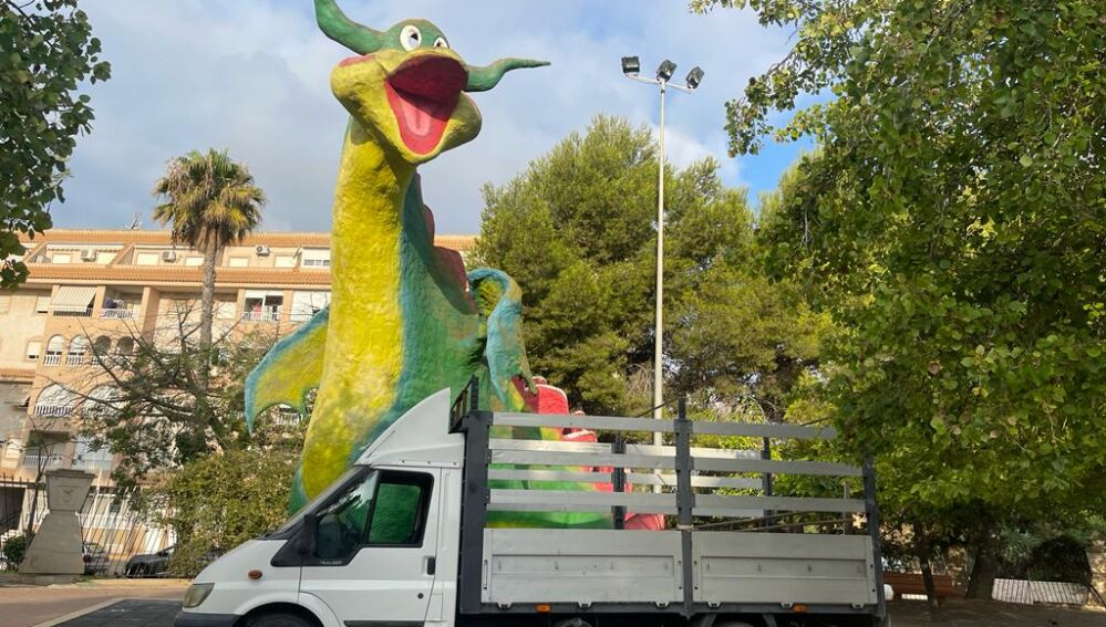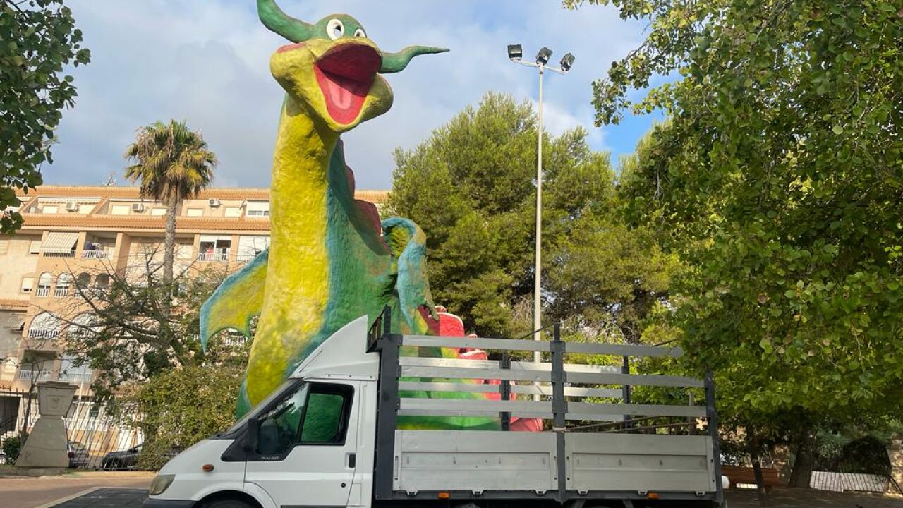 La concejal responsable de Parques y Jardines del Ayuntamiento de Torrevieja, Carmen Gómez Candel, informa que ya han comenzado los trabajos de reparación del conocido dragón que se encuentra en la zona infantil de juegos del parque de Las Naciones.