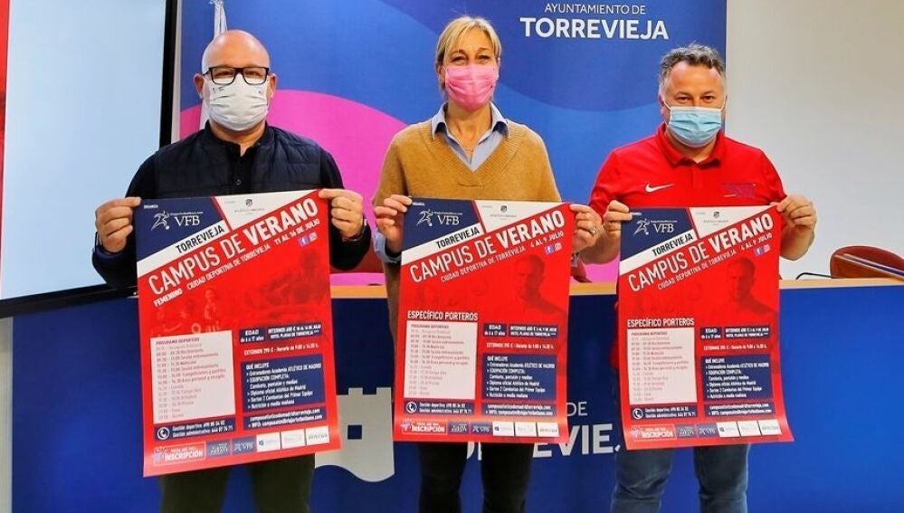 La concejal de Deportes, Diana Box Alonso, acompañada del responsable de Touroperador Viajar Fútbol Base, Alberto del Amo, y del responsable del área de Turismo Deportivo de la Concejalía de Deportes, Javier López, han presentado en la mañana de hoy el Campus de verano VFB Academia Atlético de Madrid “Ciudad de Torrevieja”, que tendrá lugar del 4 al 16 de julio en la Ciudad Deportiva de Torrevieja.