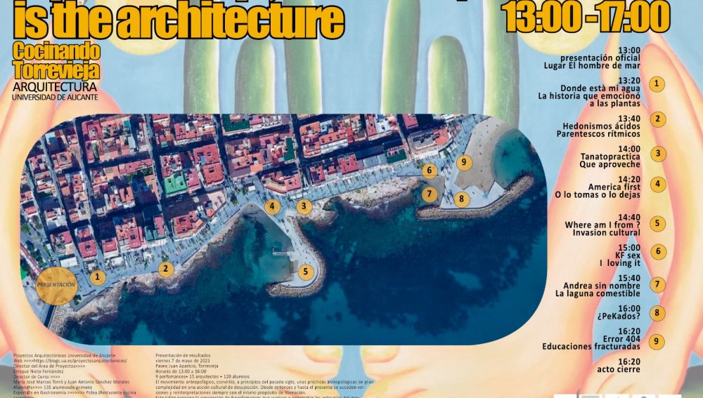 El ciclo está organizado por los profesores Enrique Nieto Fernández, María José Marcos y José Antonio Sánchez, del grado de Arquitectura de la Universidad de Alicante (asignatura Proyectos Arquitectónicos). En “Cocinando Torrevieja” los organizadores detallan que “proponemos una inmersión en los diferentes aspectos en los que el asunto de ‘la comida’ se desarrolla en la ciudad de Torrevieja, caracterizado por un conjunto heterogéneo de historias, conflictos y realidades en el que compondremos nuevas cartografías gastronómicas desde la arquitectura y la ciudad, donde imaginemos y diseñemos nuevas posibilidades para un futuro más sostenible, inclusivo y evolucionado”.