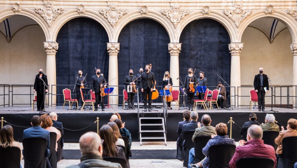 El claustro de la Universidad del Colegio Diocesano Santo Domingo fue el escenario del concierto que ofreció Ensemble Casa Mediterráneo, con una asistencia de más de 190 personas que se sometieron rigurosamente a las medidas impuestas por la normativa Covid para espectáculos públicos.