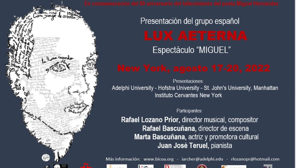 El gupo de Orihuela ‘Lux Aeterna’ ha sido invitado para representar entre el 17 y el 20 de agosto de 2022 en Nueva York el espectáculo ‘Miguel. Homenaje a Miguel Hernández’ en conmemoración del 80º aniversario del fallecimiento del poeta oriolano y dentro del marco de la IV Conferencia Global de Investigadores Universitarios sobre temas del mundo hispánico.