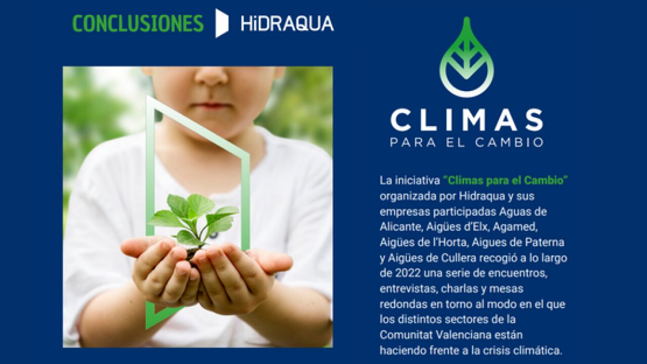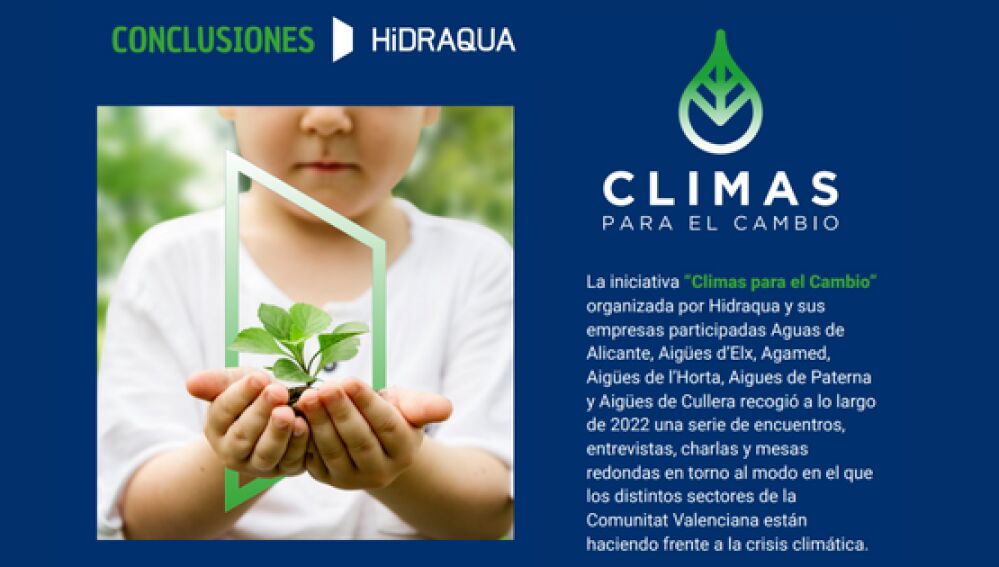 “Climas para el Cambio” es una iniciativa de Hidraqua y sus empresas participadas, Aguas de Alicante, Aigües d’Elx, Aigües de l’Horta, Aigües de Paterna, Agamed y Aigües de Cullera. Más de un centenar de asistentes han estado presentes en estas conversaciones y contó con la retrasmisión en streaming de parte de sus encuentros con más de 130 visualizaciones de media.