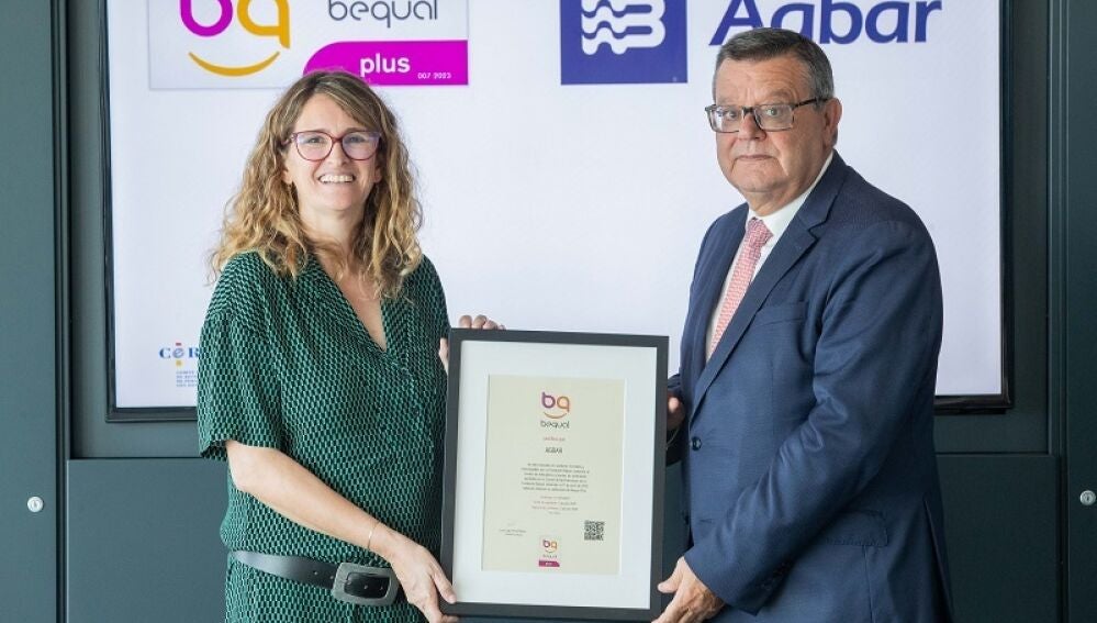 La entrega se ha celebrado en las oficinas de Agbar en Madrid y Dulcinea Meijide, directora de Equidad de Agbar, ha sido la encargada de recoger el sello Bequal Plus de manos de José Luis Martínez Donoso, vicepresidente ejecutivo de la Fundación Bequal y director general de Fundación ONCE.