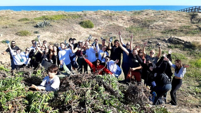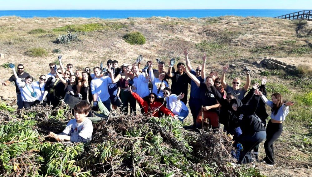Además, un grupo de alumnos de la Universidad de Siracusa (Nueva York, Estados Unidos) han colaborado hoy sábado en las tareas de control de Especies Exóticas Invasoras (una de las principales amenazas para la biodiversidad de los sistemas dunares) mediante una actividad de voluntariado que pretende avanzar en el control y erradicación de la uña de gato o Carpobrotus acinaciformis.