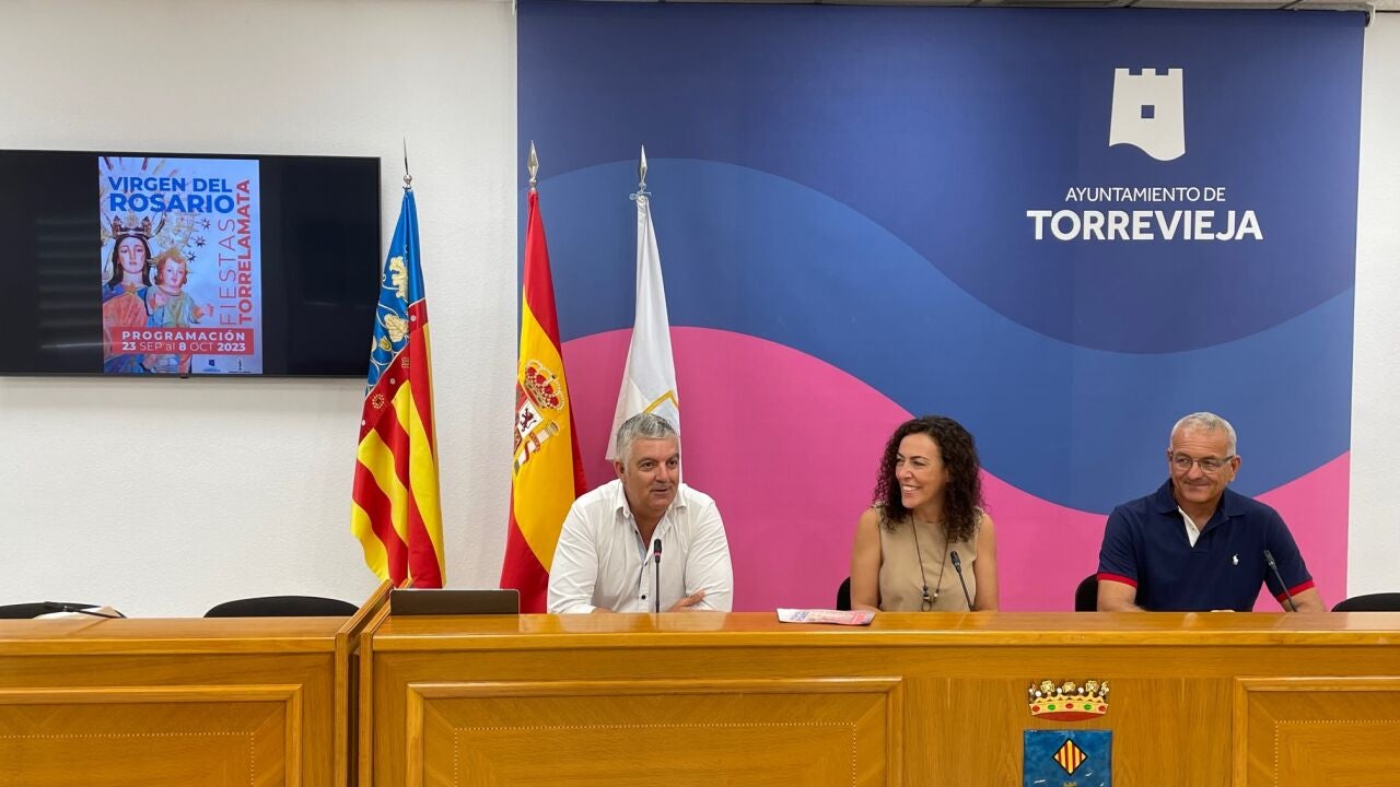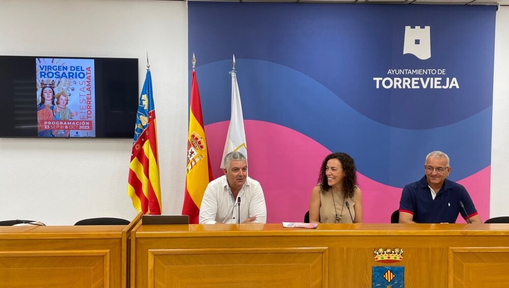 La concejal de Fiestas del Ayuntamiento de La Mata, Rosario Martínez, acompañada del concejal de Medio Ambiente y Playas, Antonio Vidal, y el representante de la Cofradía Nuestra Señora del Rosario de La Mata, Cayetano Gil, han presentado el programa de fiestas en honor a la Virgen del Rosario, que se desarrollarán desde el sábado, 23 de septiembre, hasta el domingo, 8 de octubre en la pedanía torrevejense.