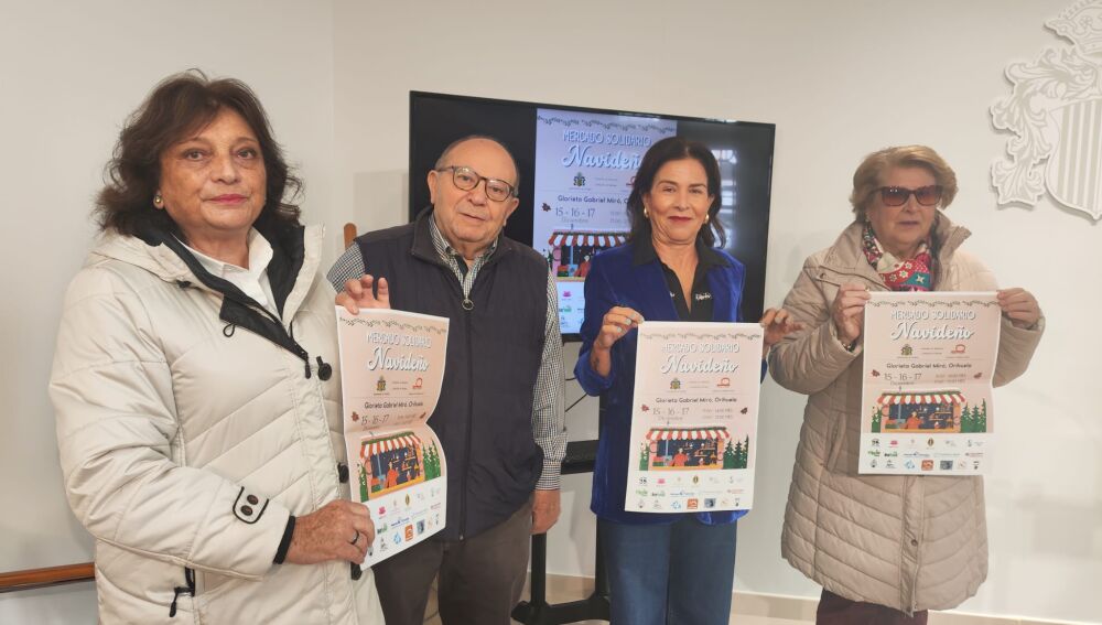 La concejala de Bienestar Social, Agustina Rodríguez, ha presentado la nueva edición del Mercado Solidario Navideño que tendrá lugar del 15 al 17 de diciembre en la Glorieta Gabriel Miró. La edil ha estado acompañada en la presentación por Esteban Sanmartín, presidente de Más Vida, Gertru Marcos, presidenta de ADIEM, y María Pilar Ruiz, de Hospitalidad de Lourdes Orihuela- Alicante. El horario de apertura será de 11.00-14.00h y de 17.00-21.00h.