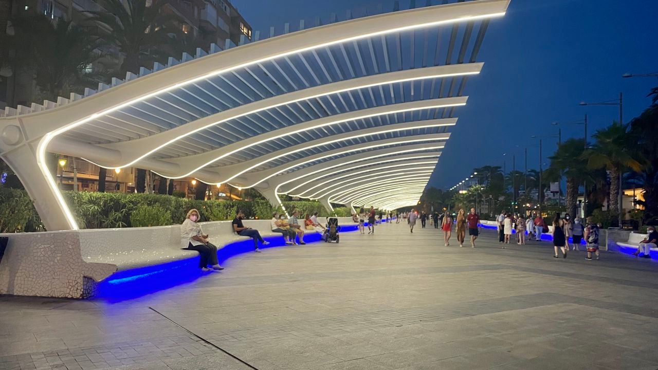 El pasado domingo, coincidiendo con la inauguración del Certamen Internacional de Habaneras y Polifonía se llevó a cabo el encendido de la nueva iluminación de la pérgola de este céntrico paseo torrevejense. La instalación se ha realizado sobre la parte inferior de las vigas metálicas de la pérgola, con un aluminio flexible, lacado en blanco, que lleva en su interior la cinta de led con una cantidad de 180 led por metro lineal, siendo aproximadamente 600 metros los que se han colocado. La tira de led elegida realiza un efecto de luz lineal para que no se aprecie el punto individual de led iluminado.