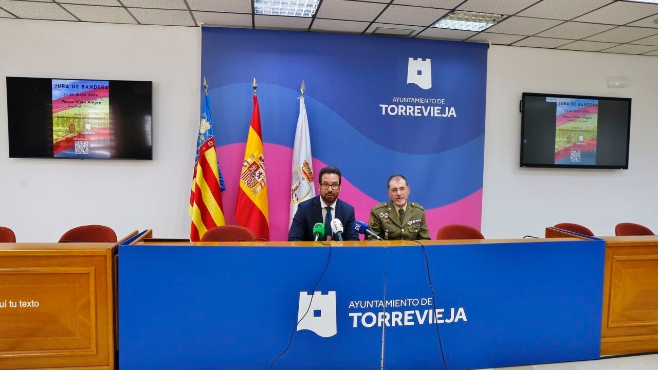 El concejal de Seguridad y Emergencias del Ayuntamiento de Torrevieja, Federico Alarcón, junto con el jefe de Comunicaciones del MOE, el comandante Alfonso Blas López, han presentado en la mañana de hoy el acto de Jura de Bandera para personal civil que se celebrará el próximo sábado, 21 de mayo, a las 12:00 horas, en el Paseo Vista Alegre.