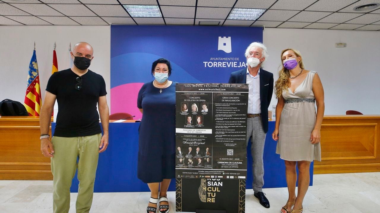 El concejal de Cultura, José Antonio Quesada, junto a la directora del Festival, Tatiana Denisova Kaunova, el director artístico, Lev Gelbard, y la violonchelista, Lana Gruen, han presentado en la mañana de hoy la segunda edición del festival de música clásica y ópera “Sol Music Festival Torrevieja” que se celebrará del 12 al 15 de agosto, a las 20:00 horas, en la sala de cámara del Auditorio Internacional de Torrevieja.