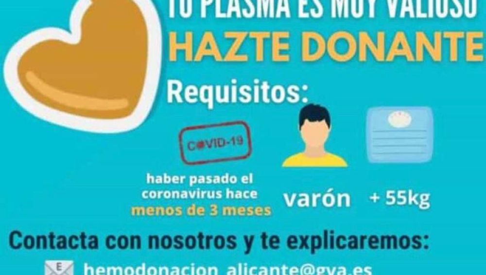 El Centro de Transfusión de la Comunitat Valenciana comenzó el pasado lunes una campaña a través de las redes sociales para fomentar la donación de plasma hiperinmune. Los requisitos para esta donación son ser varón, pesar más de 55 kilos yhaber pasado el coronavirus hace menos de tres meses.