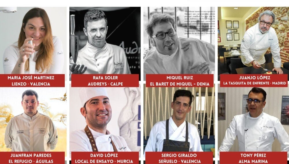 Entre ellos destaca la presencia de María José Martínez, de “Lienzo” (Valencia, 1 Estrella Michelin y 1 Sol Repsol); Rafa Soler, de “Audrey´s (Calpe, 1 Estrella y 1 Sol); Ulises Menezo “Kaido” (Valencia, 1 Estrella y 1 Sol); Miquel Ruiz, de “El Baret de Miquel” (Denia); Juanjo López, de “Tasquita de enfrente” (Madrid, Recomendado Michelín y 2 Soles Repsol); David López, de “Local de Ensayo” (Murcia, recomendado Michelin y 1 Sol); Juanfran Paredes, de “El Refugio de Juanfran” (Águilas); Sergio Giraldo, de “Señuelo” (Valencia, Chef Repsol); Víctor Infantes, de “Ancestral” (Toledo, Chef Michelin); Joan Capilla, de “Hotel gastronómico Algadir” (en el Delta del Ebro, recomendado Michelin); Tony Pérez Marcos (Alma Marina) y Enso Sushi (Alicante)