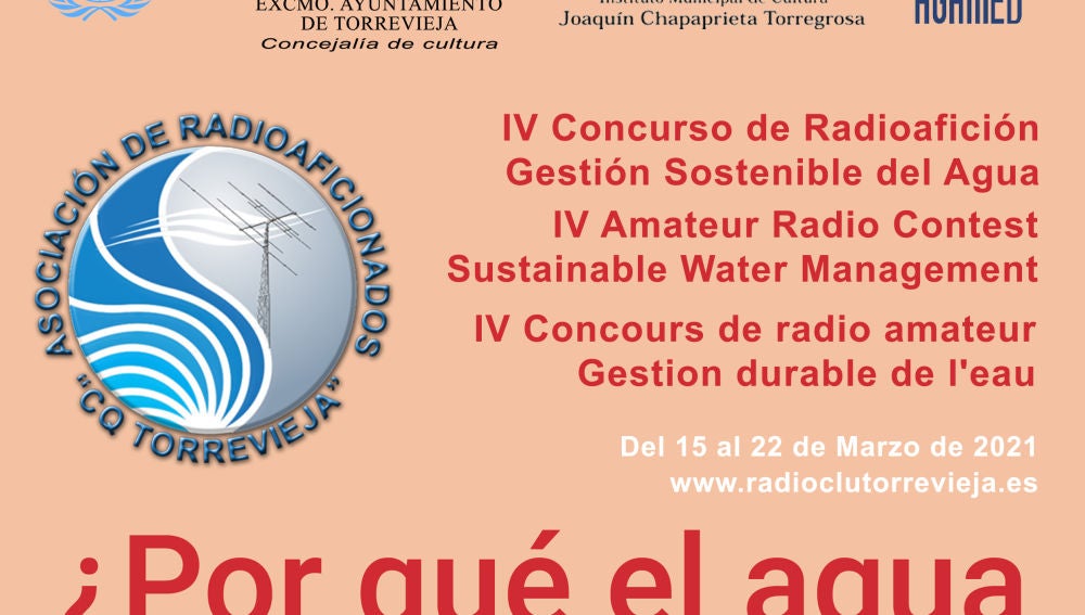 La Asociación de Radioaficionados “CQ Torrevieja”, Agamed y UNwater de Naciones Unidas se unen de nuevo, para poner en marcha el III Concurso “Gestión sostenible del agua” a partir del 15 de marzo. En este momento, cuando el mundo sufre una pandemia con la COVID es primordial el acceso tanto al agua potable, el saneamiento y la higiene, ya que es esencial para evitar agravar más las crisis con enfermedades.
