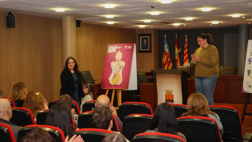 Durante el acto se entregaron los premios del concurso de ilustración impulsado por el área de Igualdad, al que se presentaron 16 obras seleccionadas para su exposición. El primer premio fue para Rebeca Brun Santiago por su obra ‘La columna vertebral d’una dona’, imagen principal del cartel oficial del 8M. El segundo galardón recayó en Marisol Agulles Guaita por ‘El mundo en tus manos’, diseño que protagonizará las tote bags de la campaña, y el tercero fue para Sandra Navarro Bou por ‘Pinceladas de memoria y revolución’.