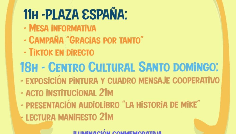 Los asistentes al mismo conocerán de primera mano la campaña de Down España, así como la versión local de la misma; escucharán por primera vez la versión sonora -realizada con la colaboración de Fundación CB, la periodista Susana Mangut y el músico Daniel Luna- del relato ganador del I concurso escolar de cuentos sobre síndrome de Down que fue fallado en diciembre. Además se leerá el manifiesto redactado por los socios con síndrome de Down y que, en esta ocasión, al tinte reivindicativo habitual de estos documentos, añade el de agradecimiento por todo lo luchado.
