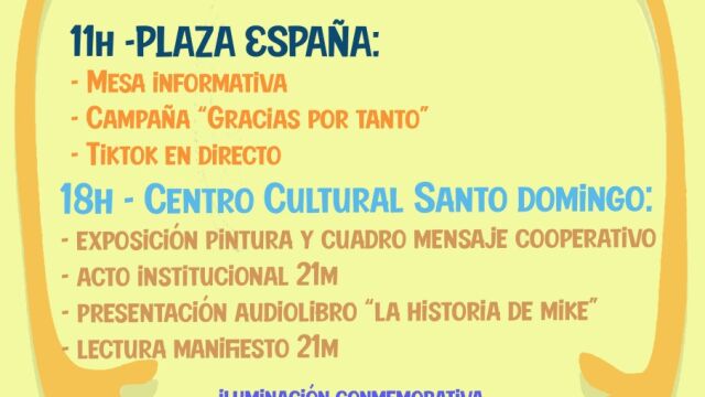 La actividad en la Plaza terminará a mediodía, después de haber realizado una performance musical a cargo de los jóvenes, profesionales y voluntarios de Down Mérida, que se utilizará para hacer un tik-tok en directo y para el que se pide colaboración a todos los que en ese momento estén en la plaza, uniéndose y participando con nosotros en el mismo. Por la tarde, la conmemoración seguirá en el Centro Cultural Santo Domingo a partir de las seis de la tarde. Allí se celebrará el acto institucional del Día Mundial del síndrome de Down.