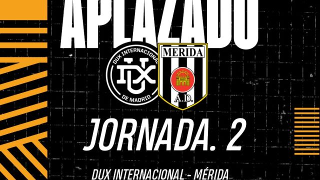 La Asociación Deportiva Mérida SAD no jugará este fin de semana la segunda jornada de liga ante el DUX Internacional de Madrid debido a la circular recibida por la Real Federación Española de Fútbol en la tarde del miércoles 31 de agosto en la que informa sobre el aplazamiento del partido.