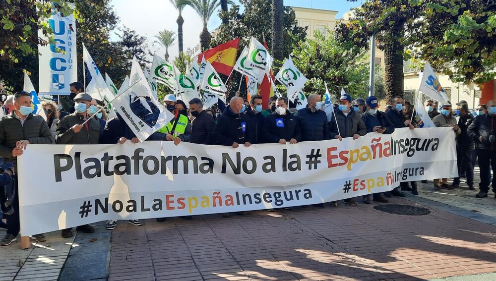 Acompañados de la pancarta 'Plataforma no a la #Españainsegura', en la concentración se han podido escuchar voces como "Marlaska dimisión", "No a la España insegura" o "Policías protegidos". En la concentración han participado también miembros del PP de Extremadura, entre ellos su presidente regional, José Antonio Monago.