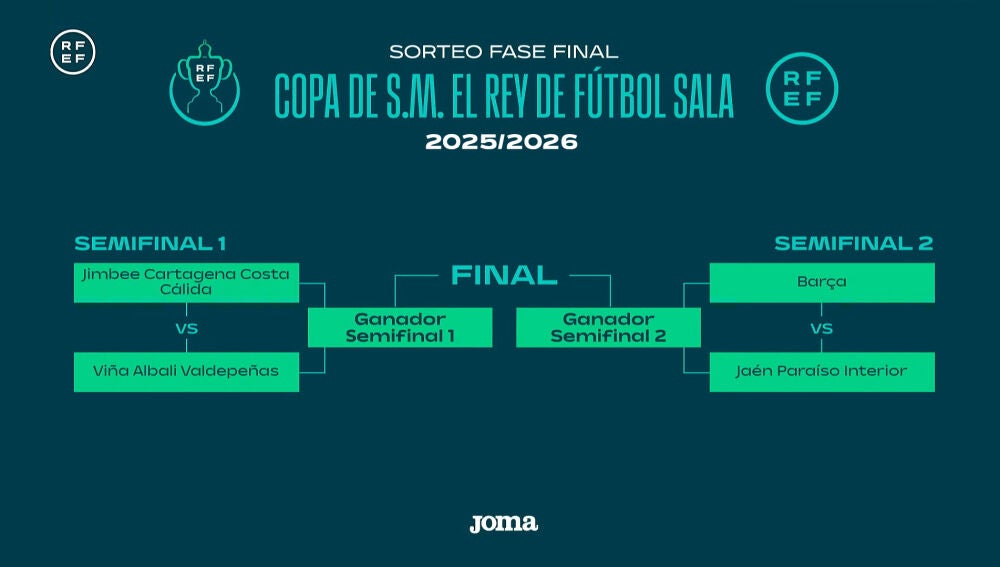 La Copa del Rey de fútbol sala ya conoce los emparejamientos de semifinales para la ‘Final Four’ que tendrá lugar en el Pabellón Multiusos de la Ciudad de Cáceres los días 23 y 24 de mayo. El sorteo, celebrado en la Ciudad del Fútbol de Las Rozas ha deparado los siguientes duelos: