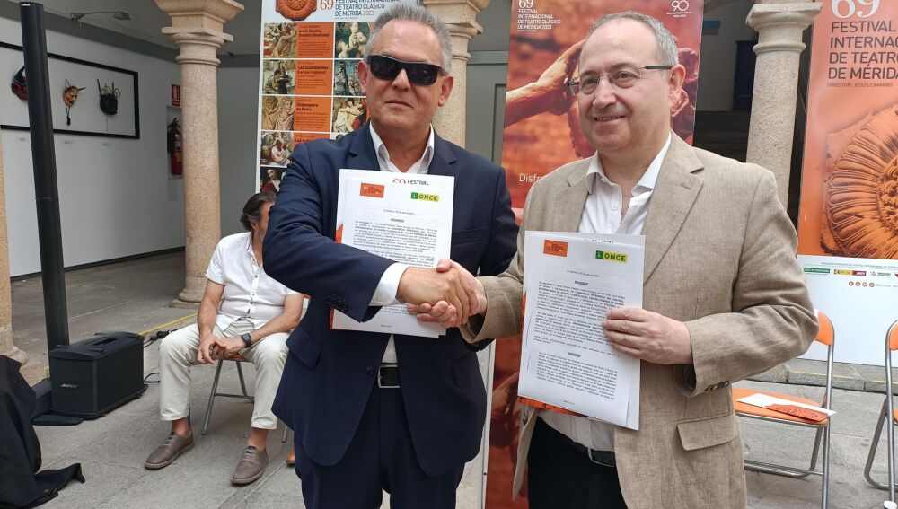 Con este convenio se pretende "impulsar la inclusión social desde la escena", ha destacado el director del Festival de Teatro Clásico de Mérida, Jesús Cimarro, en rueda de prensa este miércoles junto al delegado de ONCE en Extremadura, Fernando Iglesias, el director de Promoción Cultural de esta entidad, Ángel Luis Gómez, y el jefe de departamento de Promoción Cultural y Artística de la ONCE, Francisco José Maldonado.
