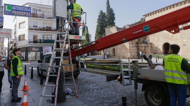 Los espacios monumentales de Mérida mejorarán su seguridad con 34 cámaras de videovigilancia que han comenzado a instalarse este martes incluidas en el proyecto Destino Turístico Inteligente.