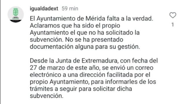"Es evidente que el alcalde ha renunciado a la financiación de la Junta, y eso perjudica a los emeritenses y al colectivo LGTBI", rezaba el mensaje que, minutos después, "desaparecía de entre los comentarios, al tiempo que bloqueaban el acceso" de la concejala 'popular' al perfil institucional de Instagram del Ayuntamiento de Mérida.