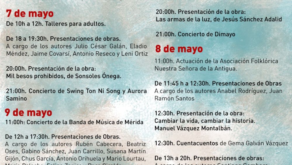 De otro lado, los talleres infantiles, Leer con los cinco sentidos, serán realizados por la narradora oral y escritora Carmen Ibarlucea en el Templo de Diana. Habrá un taller de animación a la lectura con el objetivo de activar la imaginación a través de los sentidos. Para un público de 3 a 6 años. Será el sábado, 8 de mayo, y el domingo 9 de mayo, de 18 a 19 horas.