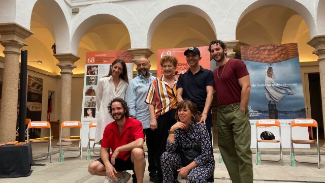 El tercer espectáculo del Festival de Mérida ha sido presentado este lunes por parte del elenco, quienes han estado acompañados por el director del certamen, Jesús Cimarro; la secretaria general de Cultura de la Junta, Miriam García Cabezas, y la portavoz municipal en el ayuntamiento emeritense, Carmen Yáñez.