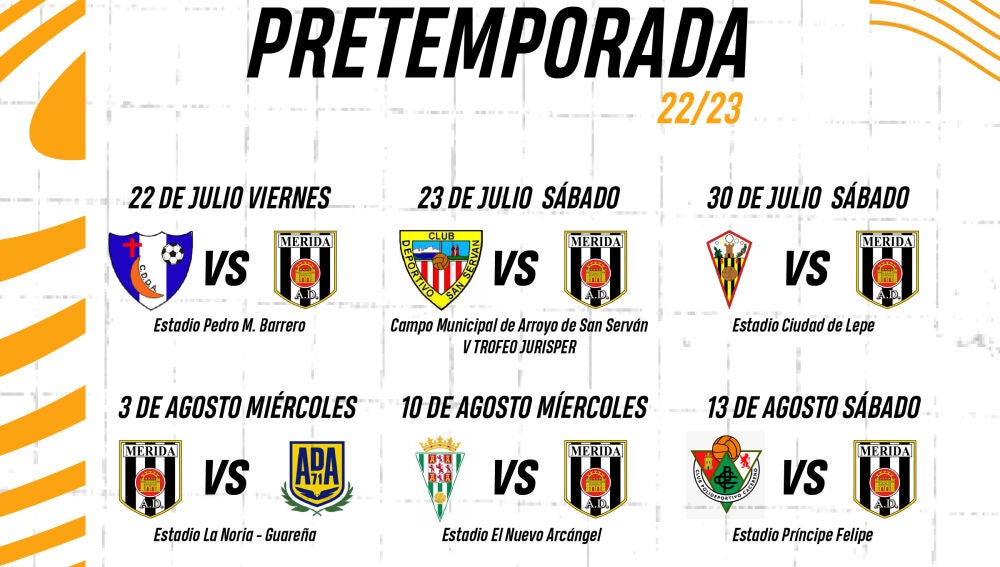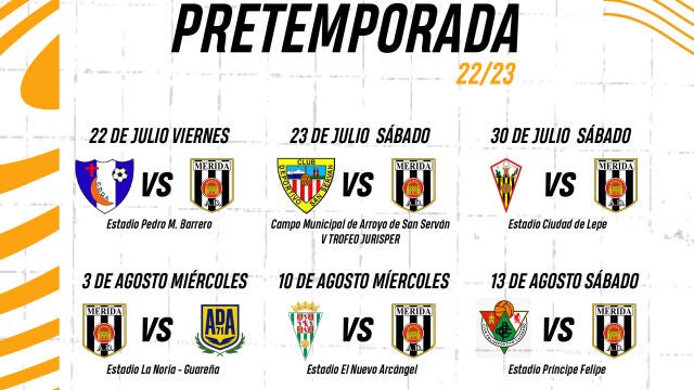 el primer partido de la pretemporada tendrá lugar el viernes 22 de julio en el estadio Pedro M.Barrero de Don Álvaro y nos enfrentará al CD Don Álvaro. El segundo partido será el sábado 23 de julio en Arroyo de San Serván ante el CD San Serván en el campo municipal arroyano.