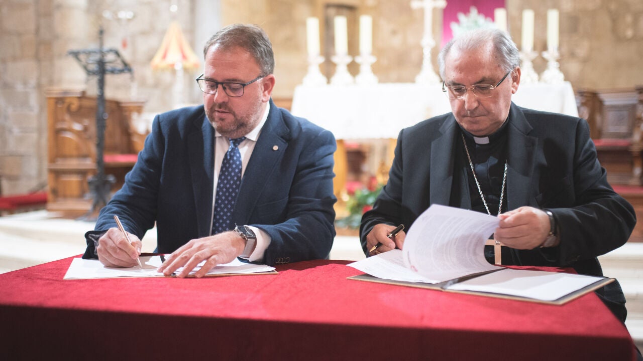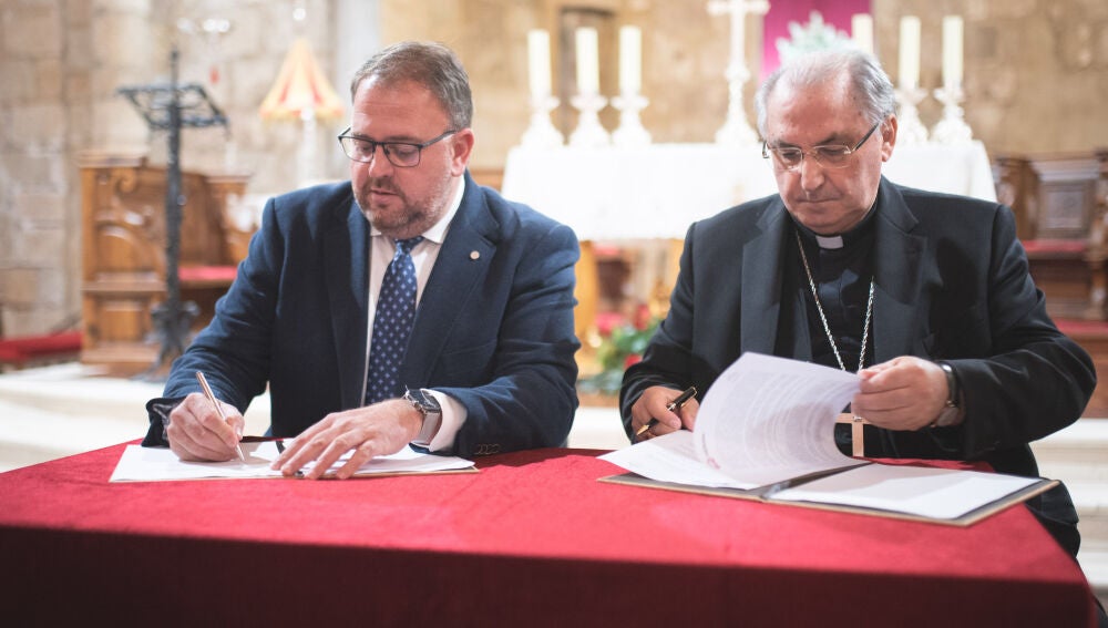 El alcalde, Antonio Rodríguez Osuna, y el Arzobispo de Mérida-Badajoz, Celso Morga, han firmado esta mañana, en la Basílica de Santa Eulalia, el convenio de permuta de los terrenos del atrio de la Basílica de Santa Eulalia, propiedad de la Iglesia, por los de Maderas Moreno, en las traseras de la Basílica, propiedad del Ayuntamiento.