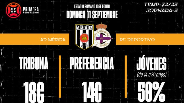 La Asociación Deportiva Mérida SAD enviará un paquete de 400 entradas al RC Deportivo de la Coruña al precio de 15 euros.