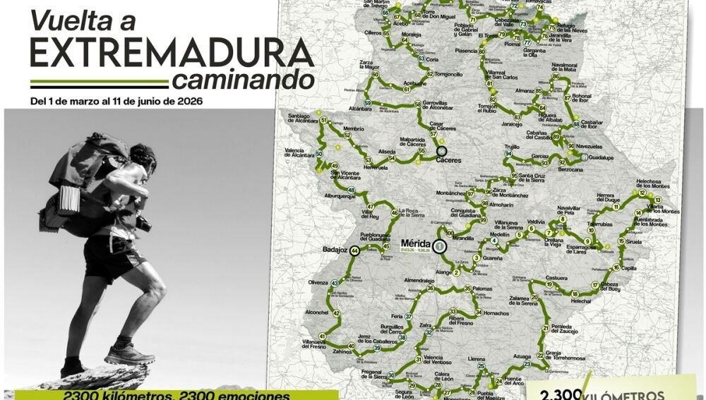 El aventurero y senderista Manuel Calderón Hidalgo, natural de Villanueva de la Serena, iniciará el próximo 1 de marzo en Mérida la Vuelta a Extremadura Caminando, un reto que le llevará a recorrer 2.300 kilómetros divididos en 100 etapas por 176 localidades de la región y que finalizará el 11 de junio también en la capital extremeña.