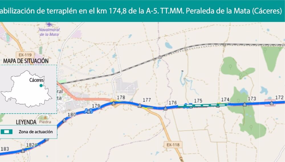 El Ministerio de Transportes, Movilidad y Agenda Urbana (Mitma) ha adjudicado por importe de 333.000 euros (IVA incluido), un contrato para la estabilización del terraplén situado en el kilómetro 174,8 de la calzada derecha sentido Badajoz de la autovía A-5, en el término municipal de Peraleda de la Mata, en la provincia de Cáceres.