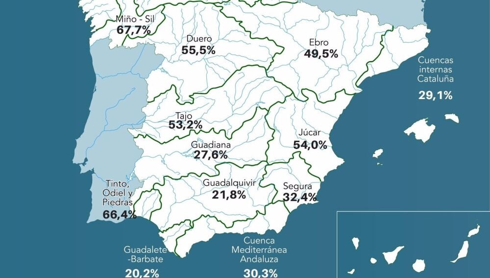 El Agua embalsada en las cuencas del Tajo y Guadiana desciende un 1,28% y un 0,6% respectivamente en la última semana. Así, los embalses del Guadiana están esta semana al 27,6 por ciento de su capacidad y los del Tajo al 53,2 por ciento, según datos del Ministerio para la Transición Ecológica y Reto Demográfico.
