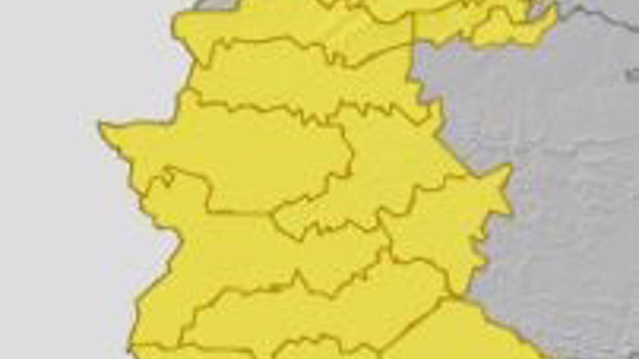 En concreto, este aviso permanecerá activo desde las 12,00 horas y hasta la medianoche en el norte de la provincia de Cáceres y el sur de la provincia de Badajoz, y desde las 15,00 horas hasta la medianoche en las comarcas de las Vegas del Guadiana, La Siberia, Tierra de Barros y La Serena, en la provincia de Badajoz, así como en las comarcas del Tajo y Alagón, Montánchez, Villuercas y la Meseta cacereña, en la provincia de Cáceres.