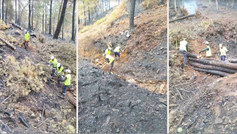 Como primeras medidas de carácter urgente, se han llevado a cabo trabajos de control de la previsible erosión hídrica en estos montes y de sus posibles efectos negativos sobre las aguas que abastecen las poblaciones de la comarca.