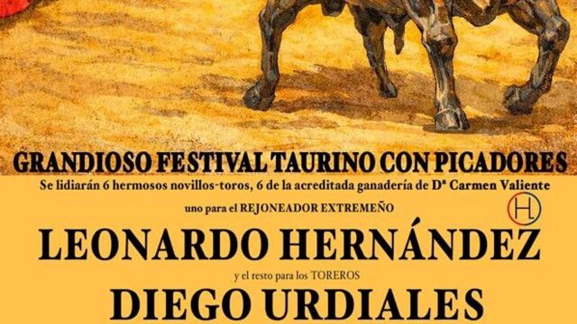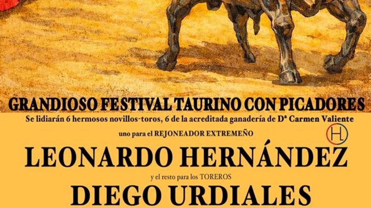 El festival taurino con picadores comenzará el sábado 14 a las 16,30 horas, con la participación del rejoneador extremeño Leonardo Hernández y los matadores Diego Urdiales, Manuel Escribano, Rafael Cerro y Ginés Marín, además del novillero cauriense Jorge Hurtado. Se lidiarán seis novillos-toros de la ganadería de Carmen Valiente.