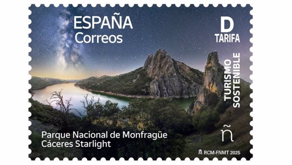 El sello tiene una tirada ilimitada, un valor postal Tarifa D (2,40 euros) y recoge una imagen del Parque Nacional de Monfragüe (Cáceres), un "buen ejemplo" de sostenibilidad y con certificación de destino turístico Starlight en 2016, señala en nota de prensa Correos.