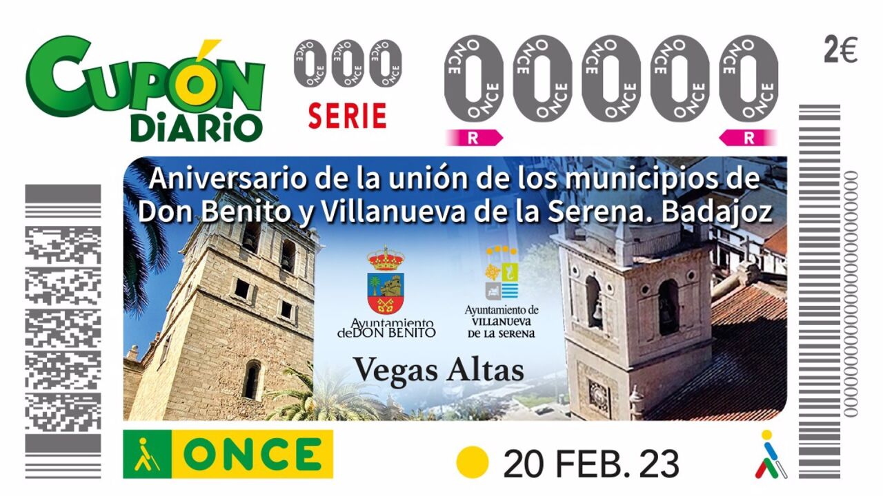 El cupón de la ONCE del próximo lunes, 20 de febrero, estará dedicado al aniversario de la unión de los municipios de Don Benito y Villanueva de la Serena bajo el nombre de Vegas Altas y, de este modo, cinco millones de cupones difundirán el nombre de la nueva localidad pacense.