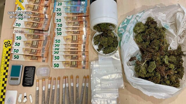 Así, en el registro practicado en la vivienda se incautaron 22 dosis de cocaína preparadas para su supuesta venta; más de 100 gramos de cogollos de marihuana; 11 porros de marihuana listos para su distribución, así como 1.160 euros en billetes de diverso valor, una balanza de precisión y otros utensilios relacionados con la presunta distribución de droga