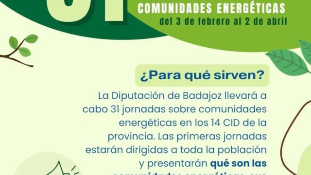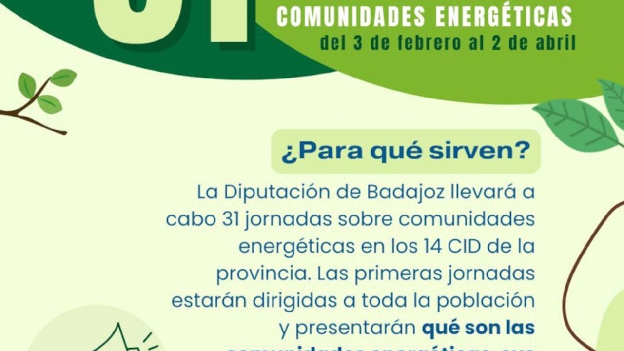 La Diputación de Badajoz, a través de su Oficina de Transformación Comunitaria (OTC) Provincial, ha puesto en marcha un programa de 31 jornadas informativas y formativas en los 14 Centros Integrales de Desarrollo (CID) y tres anexos de la provincia, en el marco de un proyecto que tiene como objetivo fomentar la creación de comunidades energéticas locales, a la vez que se resaltan sus beneficios económicos, sociales y medioambientales para ciudadanos, empresas y entidades públicas.