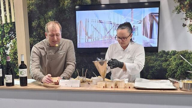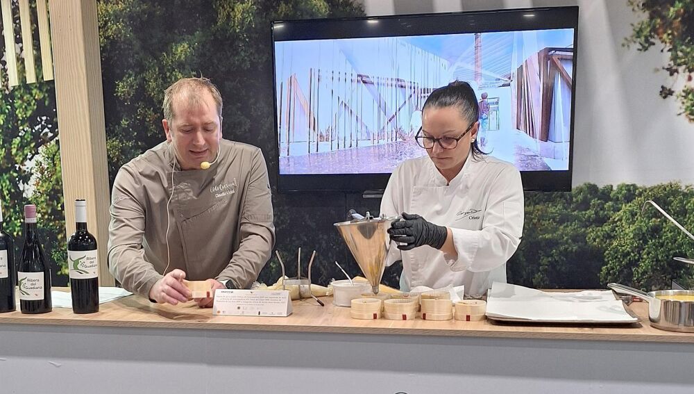 Por su parte, Juan Santiestebán, cocinero del restaurante La Fabiola, en Cáceres, preparará un bombón de Torta del Casar, Cereza de Jerte guisada y tierra de Aceite de Villuercas-Ibores. El primer plato se ha presentado en el stand de las diputaciones extremeñas este lunes, 26 de enero, y el segundo se preparará el miércoles a las 13,30 horas.