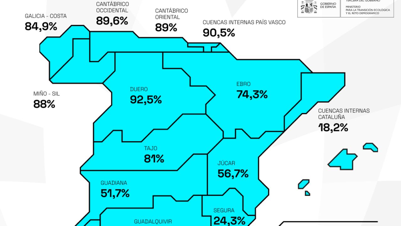 Los embalses del Tajo se sitúan al 81 por ciento de su capacidad (con 8.954 hectómetros cúbicos en total), y los del Guadiana al 51,7 por ciento (con 4.929 hectómetros cúbicos acumulados).