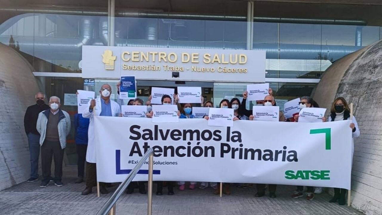 Enfermeras y fisioterapeutas de Atención Primaria se han concentrado este jueves a las puertas del centro de salud Sebastián Traba en Cáceres y en el de Valdepasillas en Badajoz, para protestar por la precariedad laboral del colectivo y los incumplimientos de las administraciones respecto al refuerzo de plantillas y contratos estables que puedan proporcionar una atención de calidad a los pacientes.
