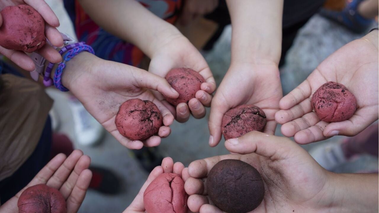 Para finalizar la jornada, los estudiantes de Pinofranqueado han realizado un taller de Nendo Dango, creando bolas de arcilla con semillas que luego han lanzado y que servirán para regenerar el suelo de la plantación.