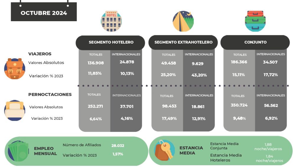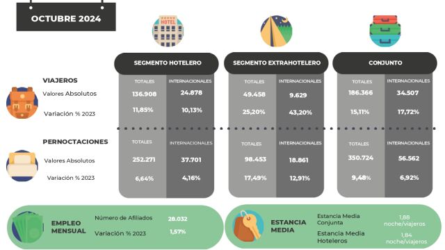 Con respecto a los viajeros de procedencia internacional nos visitaron 34.507 turistas, un 17,72 % más, que generaron 56.562 pernoctaciones y un crecimiento del 6,92 % con respecto a octubre de 2023.